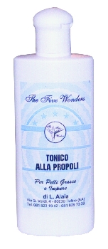 Cod.103 Tonico alla Propoli (200 ml.) Indicato per pelli miste ed impure. Modo d?uso: Dopo aver pulito la pelle con il latte detergente alla propoli tonificarla versando poche gocce di prodotto su un batuffolo di ovatta umida, eseguire un leggero picchiettamento. |