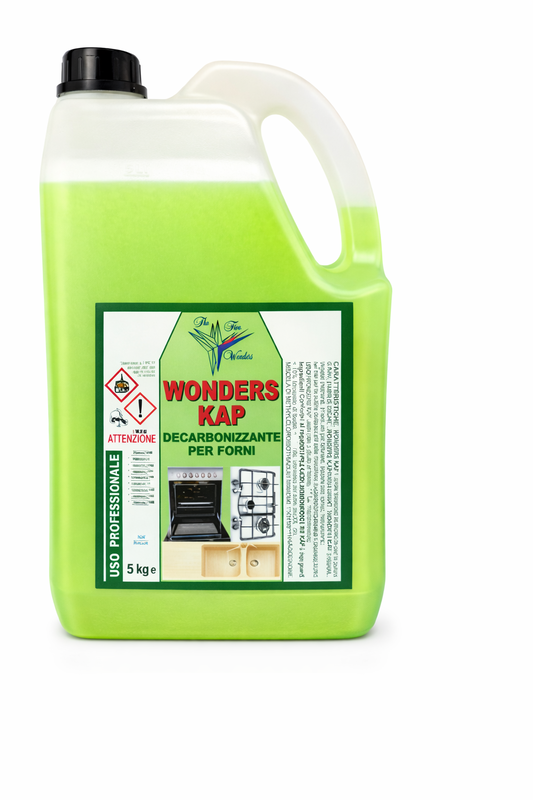 Cod.388 WONDERS KAP (5 lt.) Decarbonizzante professionale certificato HACCP che rimuove grasso carbonizzato, residui ostinati e incrostazioni da superfici di cottura, restituendo pulizia profonda in tempi rapidi. Campi d'impiego: